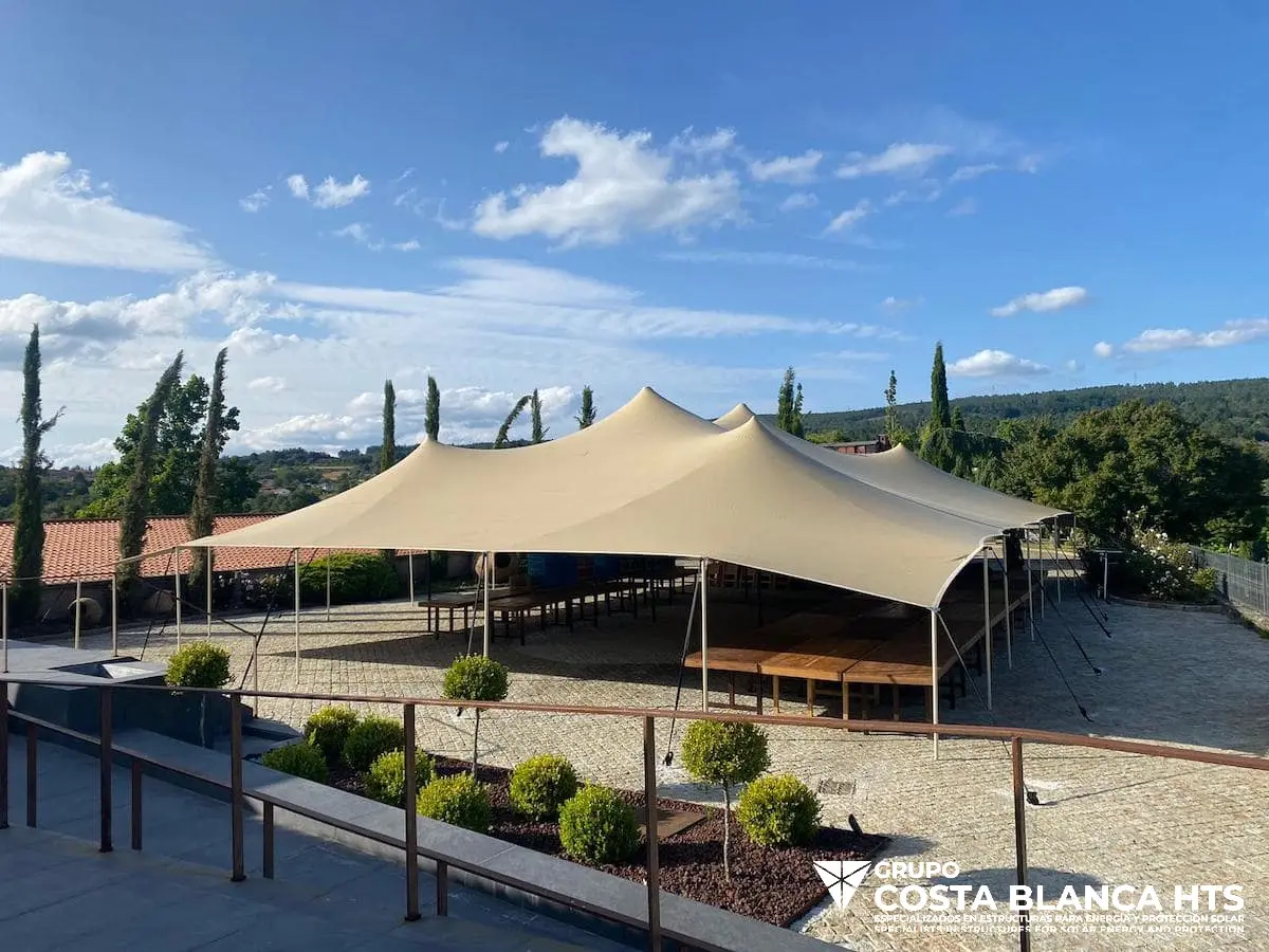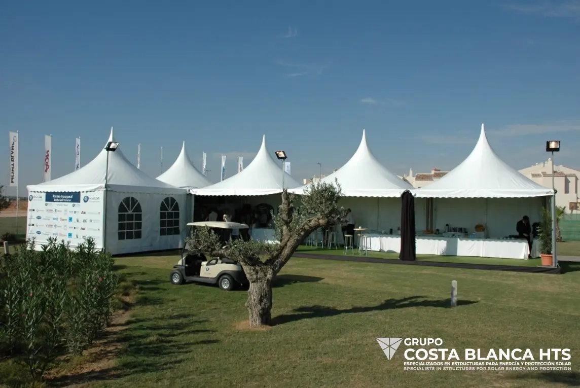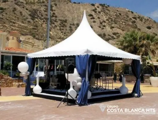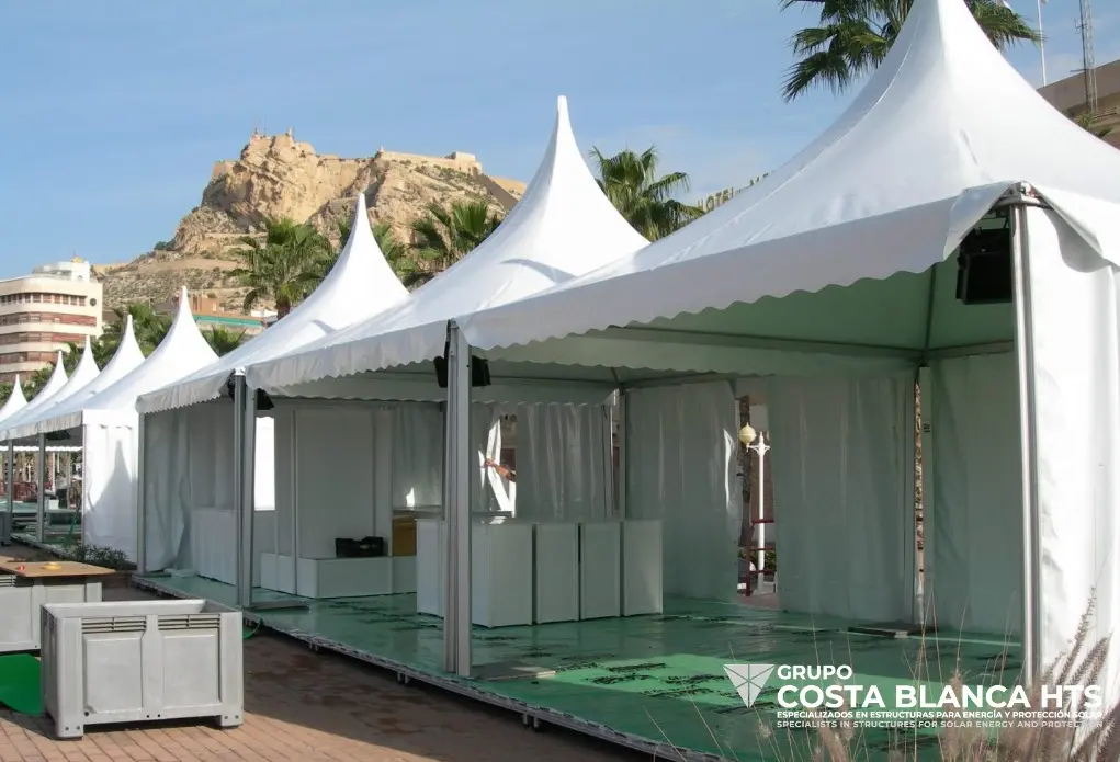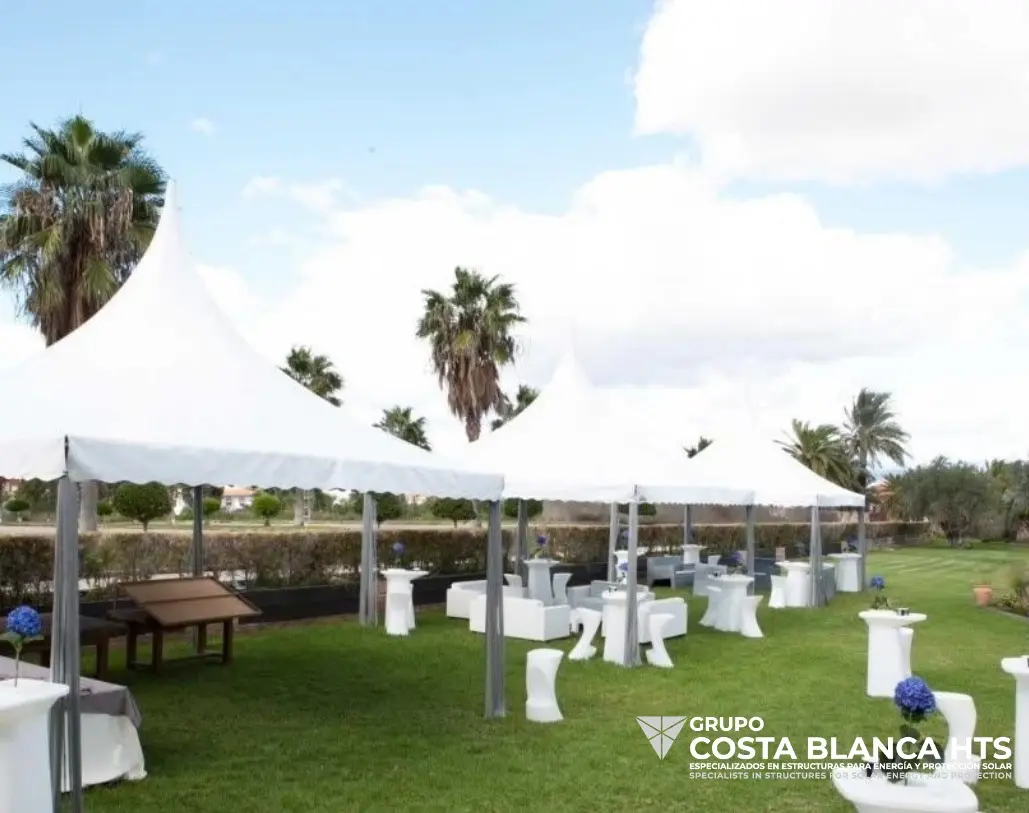En Carpas Costa Blanca HTS, somos especialistas en crear espacios únicos y funcionales a través de nuestras soluciones de diseño, fabricación, alquiler e instalación de carpas. Desde estructuras compactas de 4×4 para pequeños eventos hasta enormes carpas industriales y de doble planta, ofrecemos una variedad de opciones versátiles que se adaptan perfectamente a las necesidades de nuestros clientes.